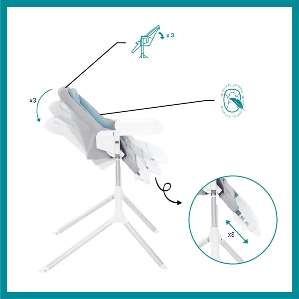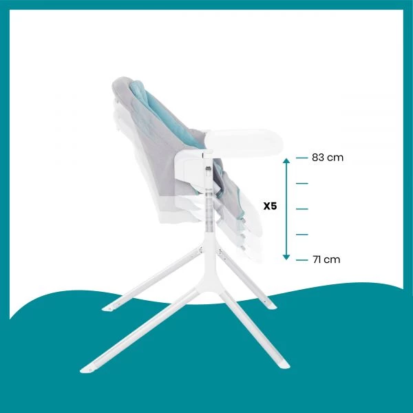 Ihr Baby kann von Geburt an bequem im Babymoov Slick Hochstuhl liegen. Der Stuhl wird mit einer Einlage aus Memory-Schaumstoff für Neugeborene geliefert, die Sie herausnehmen können, wenn Ihr Kind sich selbstständig aufsetzen kann. Der Sitz lässt sich leicht in eine Liegeposition einstellen, in der der Körper Ihres Kindes optimal unterstützt wird. So müssen Sie Ihr Baby nicht einen Moment aus den Augen verlieren, wenn Sie mit der ganzen Familie am Esstisch sitzen.