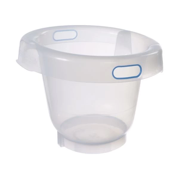 Die Bubble kann auch ohne Ständer auf einem Waschschüssel, einer Kommode oder in einer Duschwanne verwendet werden. Der oder die Griffe erleichtern den Transport und belasten nicht das Handgelenk beim Entleeren und Befüllen.