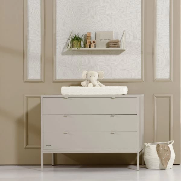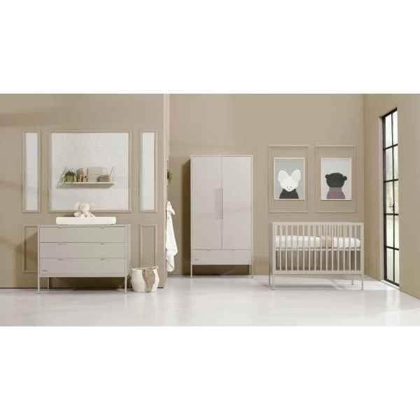 Das Amy Babyzimmer Oatmeal zeichnet sich durch seine hohen Metallbeine und verspielten Griffe aus, die bei allen Möbeln zu finden sind. Die Möbelstücke haben eine hellgraue Farbe, die sich gut kombinieren lässt. Die Möbel bieten verschiedene Aufbewahrungsmöglichkeiten, sodass du alle Kleider und Pflegeprodukte für dein Kind an einem Ort unterbringen kannst.