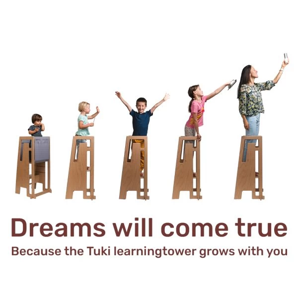 Mit diesem Tuki Lernturm – Holz – Weiß lernt dein Kind spielerisch alle möglichen Orte im Haus zu entdecken. Das Design sogt nämlich dafür, dass dein Kind lernt, sich auf verschiedenen Ebenen zu entwickeln, und macht es neugierig, seine Umgebung auf eigene Faust zu erkunden. Du kannst den Turm zum Beispiel in die Küche schieben, wo dein Kind beim Zubereiten von Speisen helfen kann, lernen, sich die Hände unter dem Küchenhahn zu waschen, oder in die Nähe eines Fensters, wo dein Kind schauen kann, was draußen passiert. Natürlich hat dein Kind oben auf diesem Turm eine tolle Aussicht. Der Turm ist für Kinder von 1 bis 8 Jahren geeignet und hat ein maximales Tragegewicht von 100 kg, sodass Erwachsene ihn auch als normalen Tritthocker nutzen können. Die Stehhöhe ist in 3 Höhen verstellbar, um es für verschiedene Altersgruppen geeignet zu machen. Zusätzlich kannst du den Lernturm mit dem separat erhältlichen Tuki Entdeckertuch weiter ausbauen, um ihn noch sicherer in der Anwendung zu machen. Das Tuch gibt den Kleinsten die Möglichkeit, sicher die Aussicht vom Turm aus zu genießen und verhindert, dass dein Kind hindurchrutscht. Das Tuch kann nur verwendet werden, wenn der Lernturm in der höchsten Position verwendet wird.